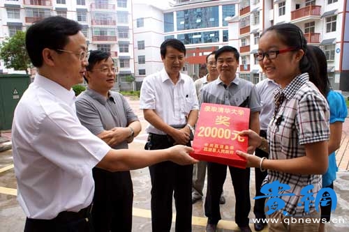 7月26日,荔波縣委書記閔路明、縣長瓦標龍為該縣首位考上清華大學的學生姚茜送去了錄取通知書和2萬元的獎勵金。