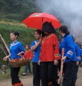 進(jìn)門禮。新娘將到男方家時(shí),男方家老人在門前燒一堆火等候,新娘一到便把腳伸到火苗上晃一晃。然后脫掉布鞋,穿上男方家準(zhǔn)備好的無跟草鞋(稱"踩屋鞋"),由引娘引進(jìn)屋。八卦地區(qū)不穿男方家的細(xì)草鞋,而是洗腳后換上娘家?guī)サ男虏夹M(jìn)屋。