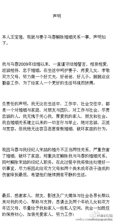 2016年8月14日凌晨,王寶強(qiáng)發(fā)表聲明,與妻子馬蓉解除婚姻關(guān)系。 8月14日凌晨,王寶強(qiáng)發(fā)布離婚聲明,稱“無法容忍惡意背叛婚姻、破壞家庭”。王寶強(qiáng)聲明中指出:馬蓉與我經(jīng)紀(jì)人宋喆的婚外不正當(dāng)兩性關(guān)系,嚴(yán)重傷害了婚姻、破壞了家庭,鄭重決定解除我與馬蓉的婚姻關(guān)系,解除宋喆的經(jīng)紀(jì)人職務(wù)。 今日凌晨,馬蓉回應(yīng)離婚及出軌事件:“欲蓋彌彰,善惡自有真相。不是不報,時候未到! 王寶強(qiáng)發(fā)聲明,指責(zé)妻子馬蓉出軌經(jīng)紀(jì)人宋喆。宋喆被曝已婚,妻子系圈內(nèi)經(jīng)紀(jì)人楊慧,楊慧發(fā)微博回應(yīng):“因果有時報”。疑似馬蓉朋友圈回應(yīng),怒斥王寶強(qiáng)瘋狗會咬人,自己做錯了事被知道了,做出傷天害理之事。