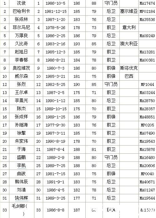 守門員 沈俊:身披1號球衣 出生日期:1986年10月5日 身高:186cm 體重:88kg 籍貫:上海 張烈:身披12號球衣 出生日期:1982年2月25日 身高:190cm 體重:85kg 籍貫:沈陽 沈鵬:身披22號球衣 出生日期:1989年2月19日 身高:188cm 體重:80kg 籍貫:徐州 孫繼海:身披17號球衣 場上位置:后衛(wèi) 1977年9月30日出生于遼寧省大連市 身高:183cm 體重:75kg 納諾(Nano):身披7號球衣 出生日期:1980年7月7日 身高:1米86 體重:79kg 久比奇: 身披6號球衣 出生日期:1983年2月16日 身高193 體重:85kg 國籍:澳大利亞 吳偉:身披2號球衣 出生日期:1983年3月10日 身高:191cm 體重:80kg 籍貫:天津 張成林:身披3號球衣 出生日期:1987年1月20日 身高:183cm 體重:76kg 籍貫:安徽 萬厚良:身披5號球衣 出生日期:1986年2月25日 身高:186cm 體重:79kg 籍貫:北京 蘆強(qiáng):身披5號球衣 出生日期:1989年1月8日 身高:186cm 體重:87kg 籍貫:大連 劉天祺:身披19號球衣 出生日期:1989年1月17日 身高:182cm 體重:80kg 籍貫:黑龍江 董陽:身披28號球衣 出生日期:1983年1月14日 身高:187cm 體重:80kg 籍貫:北京 中場 李春郁:身披9號球衣 出生日期:1986年10月9日 身高:184cm 體重:78kg 籍貫:沈陽 前衛(wèi) 于海:身披21號球衣 出生日期:1987年6月4日 身高:183cm 體重:70kg 籍貫:河南 楊一虎:隊內(nèi)最具潛力的小將 90后 攻破皇馬大門 身披14號球衣 場上位置:前衛(wèi) 出生日期:1991年9月16日 身高:175cm 體重:65kg 籍貫:廣東深圳 羅達(dá)斯:身披20號球衣 出生日期:1984年1月1日 身高172cm 體重75kg 國籍:阿根廷 楊昊: 身披29號球衣 出生日期:1983年8月19日 身高:176cm 體重:66kg 籍貫:北京 王爾卓:身披13號球衣 出生日期:1987年2月5日 身高:175cm 體重:71kg 籍貫:西安 陳杰:身披15號球衣 出生日期:1989年10月1日 身高:175cm 體重:70kg 籍貫:深圳 楊磊:身披24號球衣 出生日期:1993年1月9日 身高:180cm 體重:71kg 籍貫:云南麗江 廖林琨:身披26號球衣 出生日期:1993年1月1日 身高:186cm 體重:81kg 籍貫:武漢 郭勝: 身披33號球衣 出生日期:1993年1月7日 身高:180cm 體重:75kg 籍貫:上海 前鋒 曲波:“追風(fēng)少年” 身披27號球衣 出生日期:1981年7月15日 身高:182厘米 體重:72kg 籍貫:天津 穆斯利莫維奇(Zlatan Muslimovic) 身披9號球衣 出生日期:1981年3月6日 身高:189cm 國籍:波黑 拉法·約爾達(dá):陽光男孩 身披11號球衣 出生日期:1984年1月11日 身高:192 體重:85kg 國籍:西班牙 李凱:身披25號球衣 出生日期:1989年7月25日 身高:188cm 體重:80kg 籍貫:青島