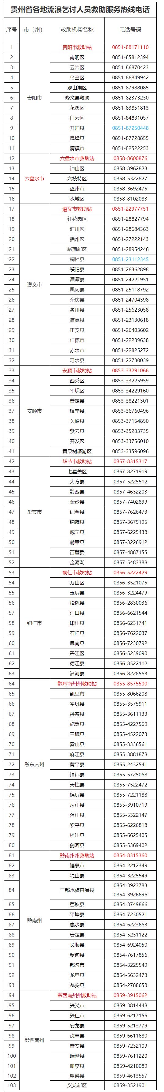 1月7日,貴州省民政廳公布省內(nèi)各地流浪乞討人員救助服務(wù)熱線電話,廣大市民如發(fā)現(xiàn)流浪乞討人員,請(qǐng)及時(shí)撥打當(dāng)?shù)鼐戎娫挘峁┚€索。