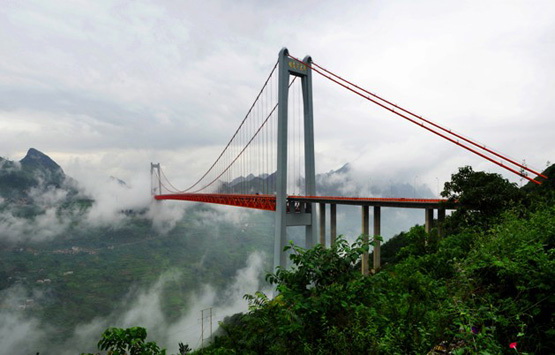 該座大橋規(guī)模身兼五個“第一”:在高山峽谷區(qū)修建如此大跨度橋梁,世界建橋史尚屬首次;西岸隧道錨碇長74.34m,為世界第一大隧道錨;東岸重力式錨碇混凝土澆筑方量達(dá)81662m³,位居國內(nèi)第一;全橋長2237m,為山嶺重丘國內(nèi)第一長橋;全橋投資14.8億元人民幣,為貴州省內(nèi)交通建設(shè)獨(dú)立大橋投資之最。該橋的建成對促進(jìn)黃果樹風(fēng)景區(qū)成為貴州旅游龍頭有著積極的意義。