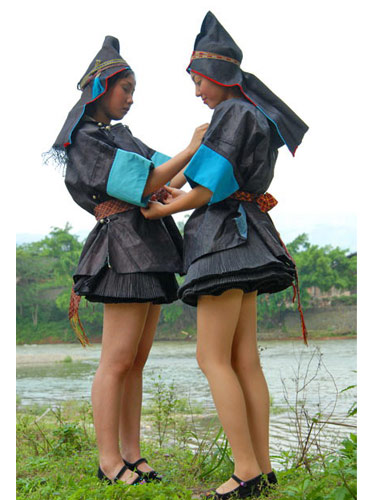 超短裙服飾:這里的苗族婦女上身是黑色斜襟湖藍折袖短衫,頭戴自制青云布做成的“人”字形尖角帽,一根絲織彩帶拴住帽子,頸部戴三至五根銀項鏈作裝飾,下身圍著僅有五寸長的黑色百褶裙和一面齊踝的彩繡圍腰。據(jù)說,很早的時候,還未曾有布料,為了抵御風雨烈日,婦女們就用樹皮折成尖尖帽戴在頭上,用芭蕉葉圍在身上,后來有了布料,裙子的褶皺便沿襲傳統(tǒng)形式做成芭蕉葉的葉脈形狀,天然無花紋圖案修飾,又因終年要跋山涉水,上坡下田勞作,天氣濕熱,裙子便慢慢演化成五寸長的超短裙了。