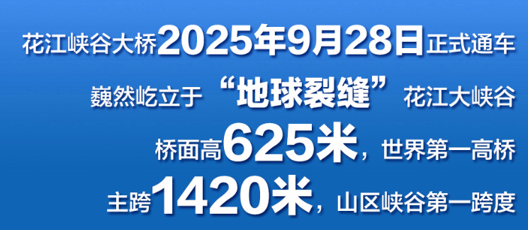 花江峽谷大橋全長2890米,跨越被譽(yù)為“地球裂縫”的花江大峽谷。大橋通車后,原來需要繞行2小時(shí)的花江峽谷兩岸貞豐縣至關(guān)嶺縣,如今僅需2分鐘即可直達(dá),真正實(shí)現(xiàn)了“天塹變通途”。